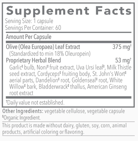 Olivirex® contains the highest potency USP grade olive leaf extract available, 18-24% oleuropein which has been shown to have antimicrobial activity against a variety of viruses, bacteria, yeasts and fungi.* The synergistic blend of additional botanicals assist detoxification, which is helpful in decreasing die-off or Herxheimer reaction. The addition of allicin, the main antimicrobial constituent of garlic and goldenseal, an abundant source of berberine are known for their antibacterial activity against a wide variety of bacteria. Olivirex® is often combined with Biocidin® as botanical support for SIBO where methane-producing bacteria are found. It also contains added immune modulators and adaptogens such as American Ginseng and Cordyceps to support immune system and adrenal health. The herbs used in this formula are certified organic or wild-crafted whenever possible.