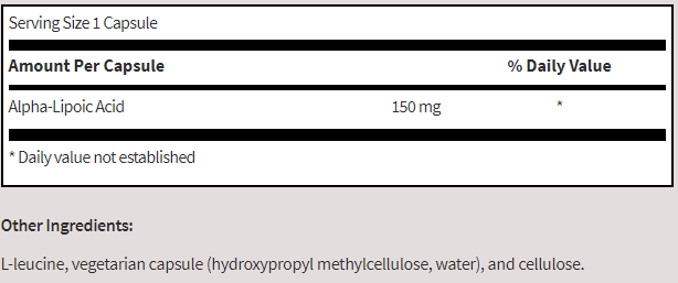 Alpha Lipoic Acid 150 mg contains alpha-lipoic acid, which is an antioxidant that helps support normal insulin function in healthy individuals. This vitamin-like nutrient helps neutralize free radicals by restoring activity of other antioxidants, such as vitamins C and E, and glutathione. Both water- and fat-soluble, it is necessary for proper conversion of calories to energy. Alpha-lipoic acid supports the liver in its detoxification efforts.