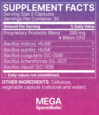 The use of spores as probiotics is highly important as spores are designed to survive through the gastric system and colonize in great numbers to produce desirable effects. Additionally, spores make a potent impact in the gut since the spore population in the gut is low enough that the 4 billion spores added each day through MegaSporeBiotic will make an impact on the sensory systems in the gastrointestinal tract to create beneficial effects. Spores are also important to police and defend the gut from unwanted microbes and to support the growth of the natural species found in each individual. A mega dose, spore culture/consortium formula with broad-spectrum activity, has only been available as a pharmaceutical drug, until now – MegaSporeBiotic is the first offered as a dietary supplement.