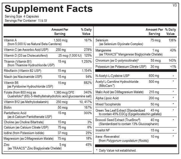 MitoCORE is scientifically formulated, based on published research, to boost mitochondrial reserves and jump-start cellular energy production. MitoCORE includes the powerful antioxidant trio of alpha-lipoic acid, N-acetyl cysteine and acetyl L-carnitine shown to increase energy production and at the same time, recharge the primary cellular antioxidant pools of vitamin E, C and glutathione. MitoCORE also includes key micronutrients and phytonutrients including green tea, broccoli seed extract and resveratrol to protect the mitochondria and continually renew the cycle of energy production.*