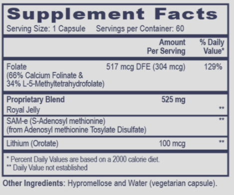 This formulation contains two forms of folate (folinic acid & L-5-Methyltetrahydofolate) and SAMe to support proper methylation and cell production. Royal Jelly has been included for its naturally occurring Bh4. Lithium has been noted in clinical research to increase Bh4 levels.