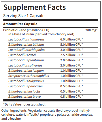 Ther-Biotic® Complete is a robust, broad-spectrum, hypoallergenic blend of 12 probiotic species in a base of inulin. Designed to supply a complete component of synergistic and complementary species, each capsule provides 25 billion CFU protected by our proprietary InTactic® technology for maximum viability throughout the intestinal tract. It provides maximum probiotic support with colonizing and transient strains in a clean and hypoallergenic formula for optimal results.