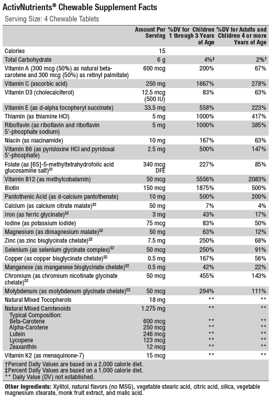 ActivNutrients® Chewable is formulated to address children’s unique nutritional needs for growth, development, and vitality and to help close the nutritional gaps that commonly result from suboptimal diets. Each great-tasting tablet provides 23 important vitamins and minerals in active, highly bioavailable forms and is free of artificial colors and flavors, preservatives, and high-fructose corn syrup.